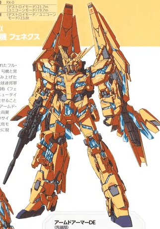What makes Phenex unique from it’s sibling units is it’s distinct gold armor with blue psycho-frame color-scheme and use of two Armed Armor DE units on it it’s back – giving it a winged appearance